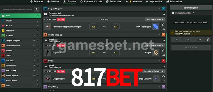 O 817Bet oferece uma grande seleção de opções de apostas em e-sports com probabilidades competitivas